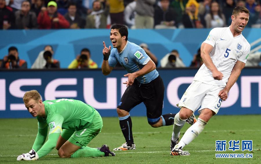 此役,英格兰队延续了上一场对意大利队的首发阵容,利物浦前锋斯图里奇充当单箭头。乌拉圭队前锋卡瓦尼首发,搭档由弗兰换成了“苏牙”,这对高效的锋线组合随后效率尽显。开场仅5分钟,苏亚雷斯便用内旋角球直接威胁哈特的大门。第38分钟,乌拉圭队策动快速反击,卡瓦尼得球后斜传穿越3名防守队员至远点,苏亚雷斯头球破门,1:0。