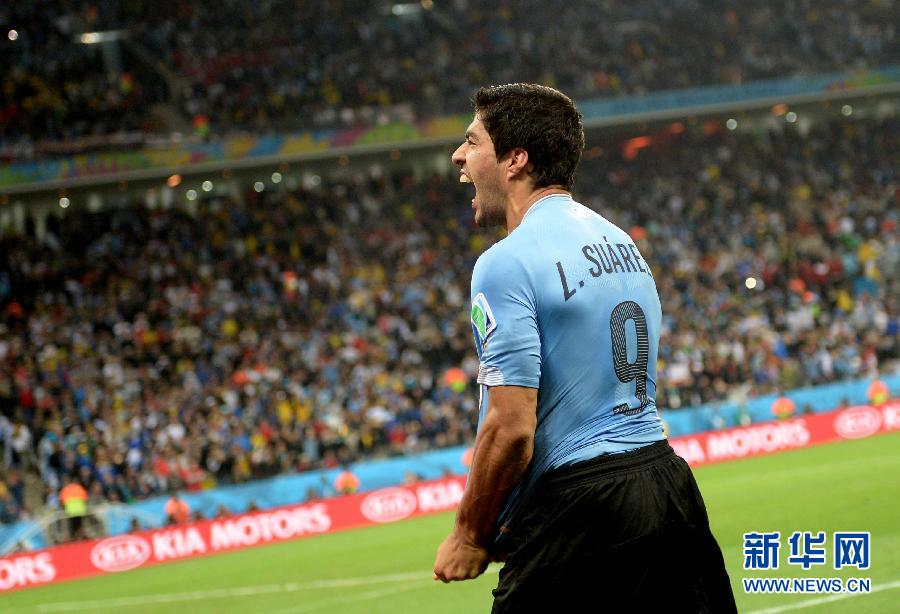 6月19日,乌拉圭队球员路苏亚雷斯赛后庆祝球队获胜。当日,在巴西圣保罗伊塔盖拉球场进行的2014年巴西世界杯小组赛D组比赛中,乌拉圭队以2比1战胜英格兰队。新华社记者李尕摄
