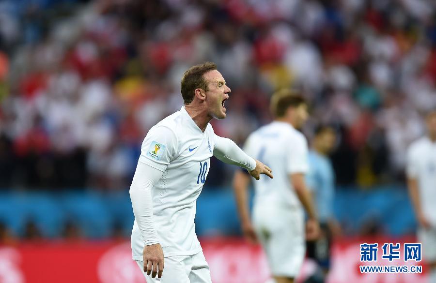 6月19日,英格兰队球员鲁尼在比赛中示意队友。当日,在巴西圣保罗伊塔盖拉球场进行的2014年巴西世界杯小组赛D组比赛中,英格兰队对阵乌拉圭队。新华社记者李尕摄