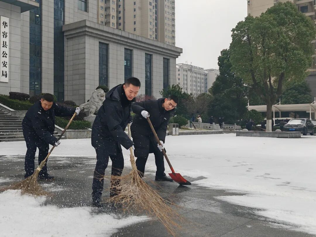 华容公安全体民辅警迎着风雪,踏上岗位,第一时间在路面撒盐融雪、清扫冰层,铺设出一条条“安全通道”。局党委副书记、政委周思亮冲锋在前,带领局机关各警种部门民辅警,迅速开展铲冰除雪作业。