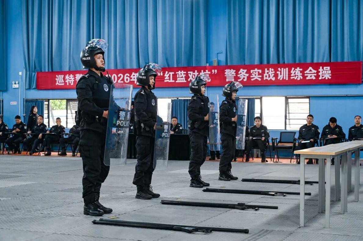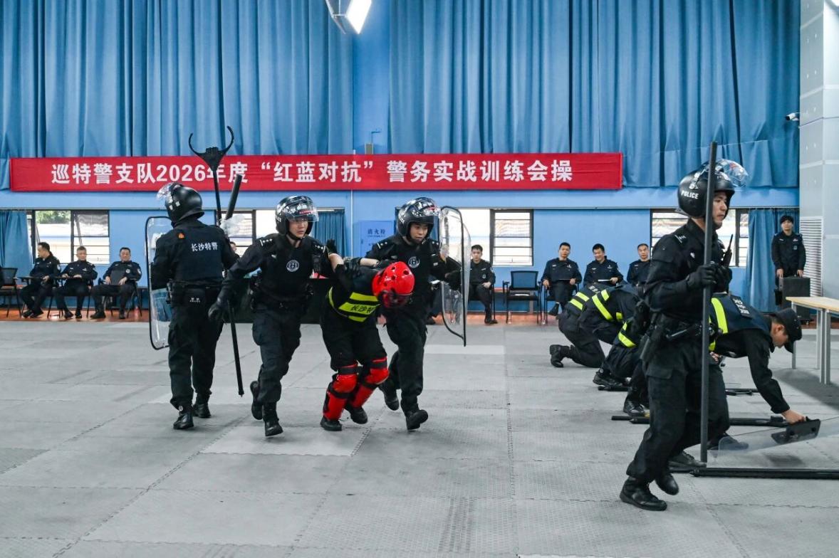 4月9日,湖南省长沙市公安局特巡警支队组织2026年度“红蓝对抗”警务实战训练会操,100余名警力参演,在真打实练中检验队伍实战能力。